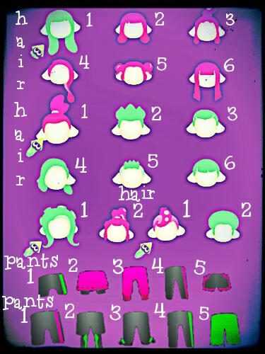 > Required: gender, skin tone, 1-3 ink colors, eye color, tentacle style, pants style, either brand/color OR Head clothing, Body clothing, Feet clothing